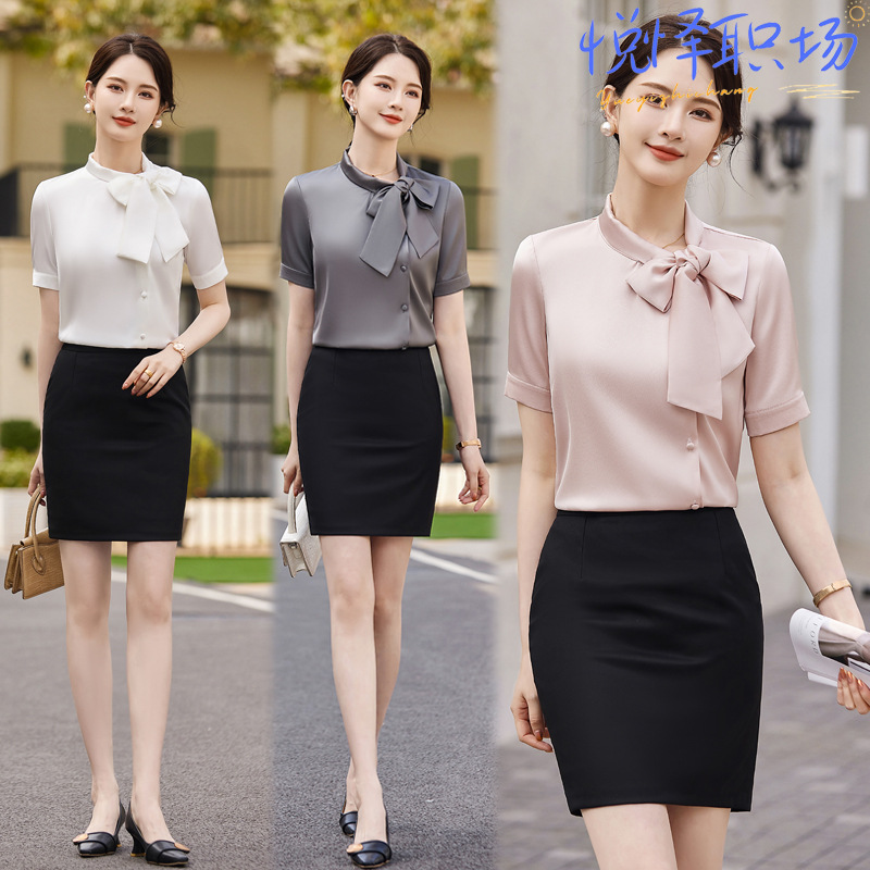 Kemeja wanita lengan pendek, baju rok setelan profesional, pakaian kerja pelayan hotel meja depan musim panas dan semi