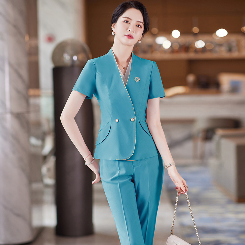 Setelan salon kecantikan lengan pendek, pakaian kerja seragam pramugari profesional, Perhiasan hotel meja depan 2024 untuk wanita