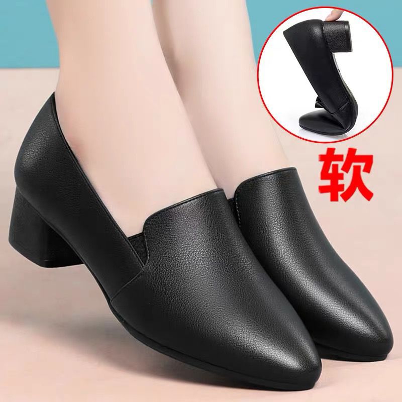 Sepatu Kerja Musim Semi dan Musim Gugur Sepatu Tunggal Wanita Profesional Warna Hitam Sepatu Kulit Hak Rendah Wanita Pakaian Kerja Pakaian Formal Hak Rendah Wanita Pramugari Hak Rendah