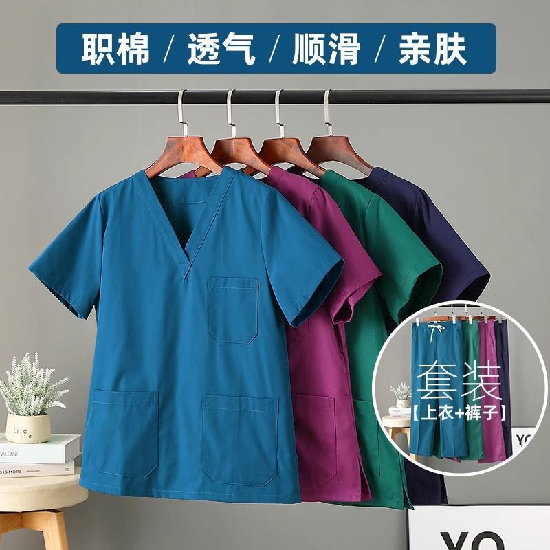 Setelan scrub katun murni untuk wanita di ruang operasi, salon kecantikan, rumah sakit hewan peliharaan, dan klinik gigi; penggunaan eksklusif untuk staf medis.