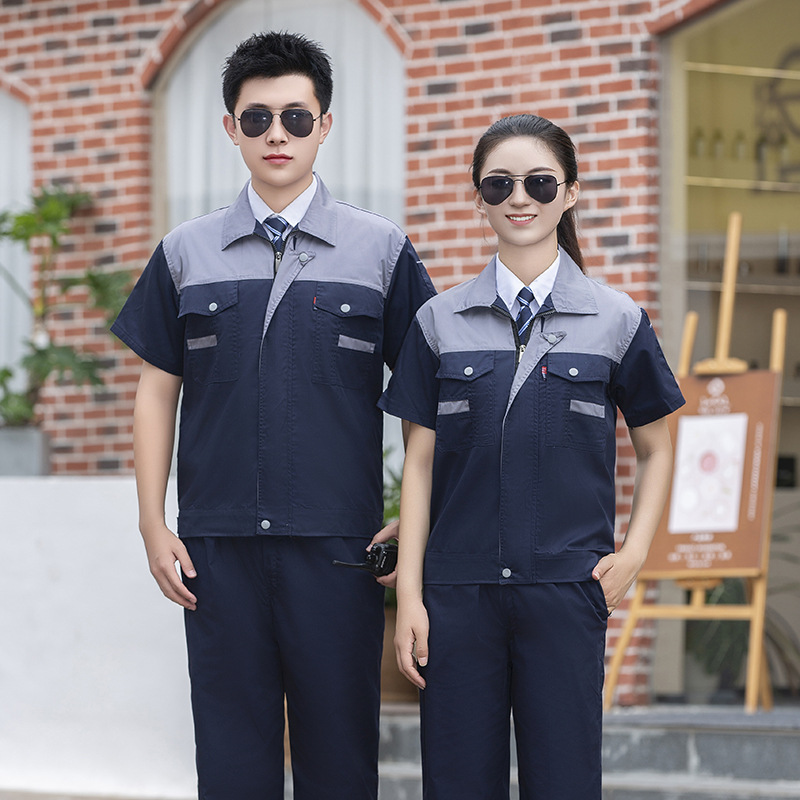 Pakaian pelindung tenaga kerja lengan pendek, tipis, nyaman, bernapas, tahan aus dan tahan kotoran logo cetak dan bordir bengkel perbaikan mesin set pakaian kerja katun murni