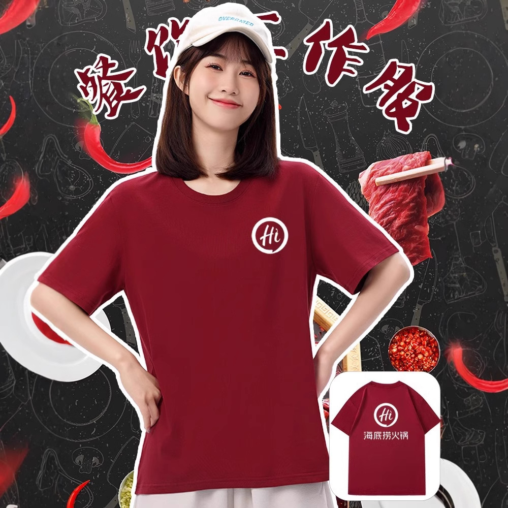Pakaian Kerja Katering Musim Panas Kaos Lengan Pendek Kerah Bulat Katun Murni Dicetak Logo Pakaian Kerja Pelayan Toko Hot Pot Supermarket Kustom