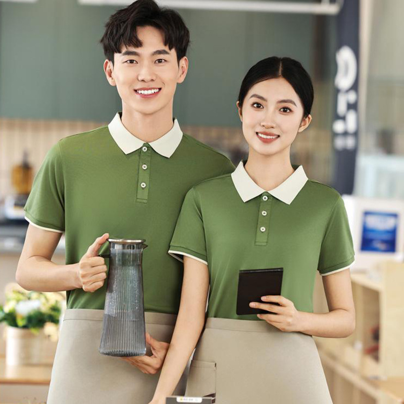 Pakaian kerja katering lengan pendek, kaus polo katun sutra es lengan pendek untuk hotel kopi cina dan restoran Barat pelayan pakaian kerja