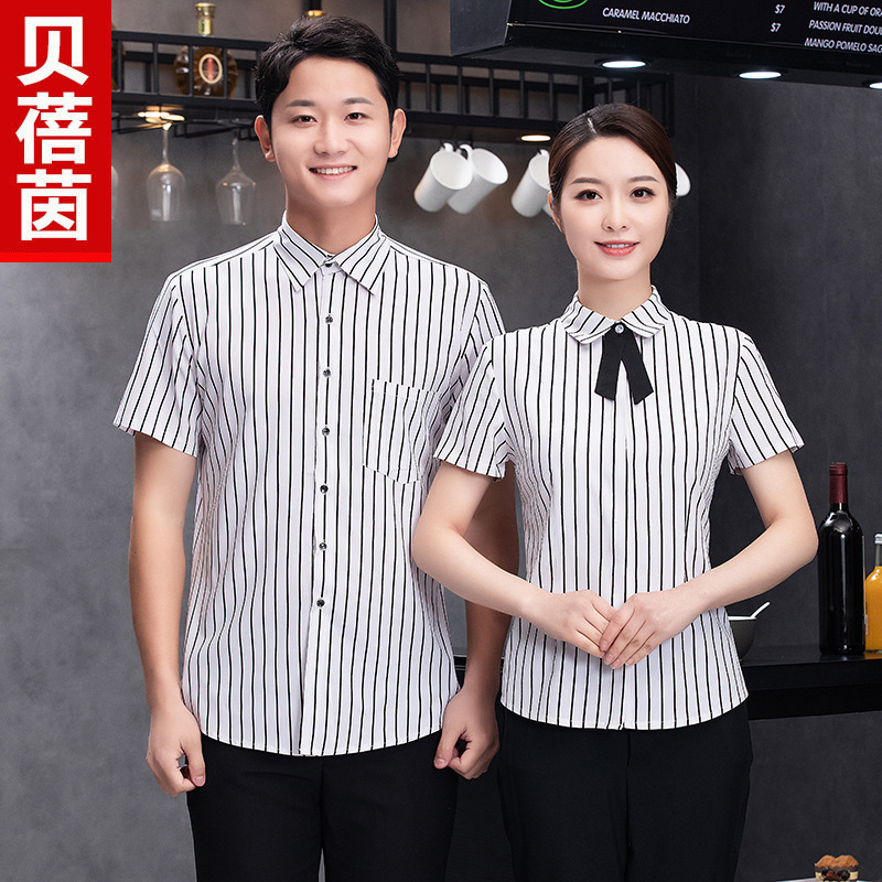 Setelan baju kerja pelayan katering Hotel, baju kerja wanita lengan pendek bergaris musim panas, baju kerja kasir penerimaan meja depan wanita