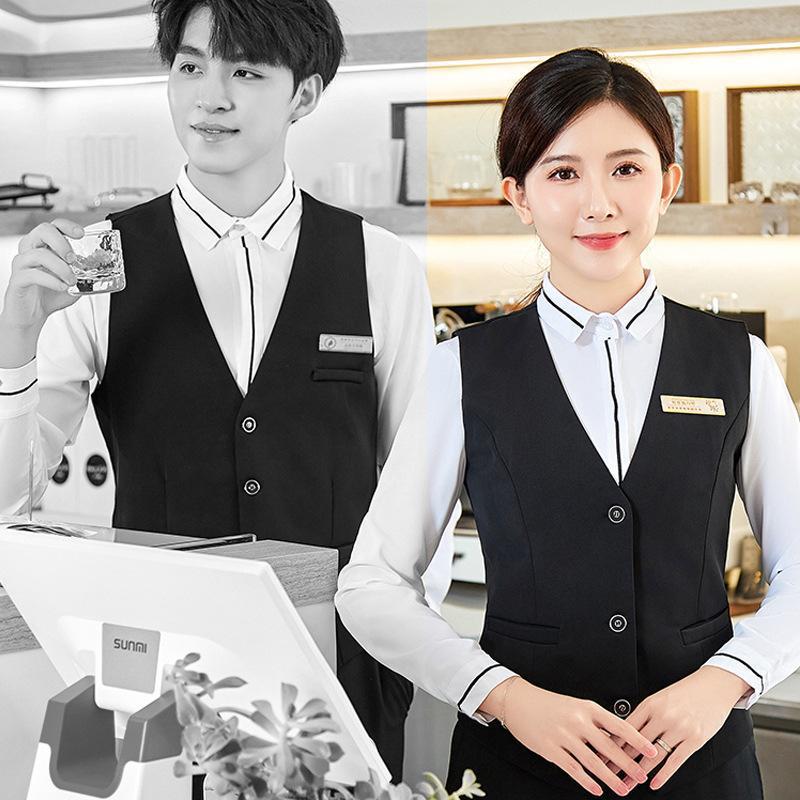 Qigu setelan rompi pelayan hotel Niang, pakaian kerja resepsionis, pakaian bisnis pria bar KTV logo bordir