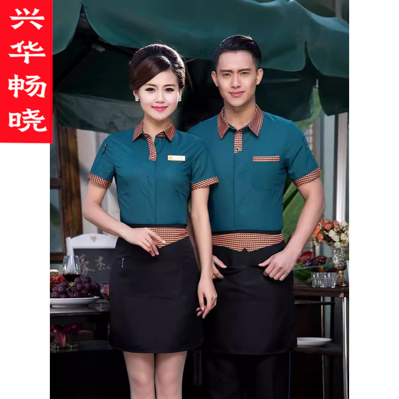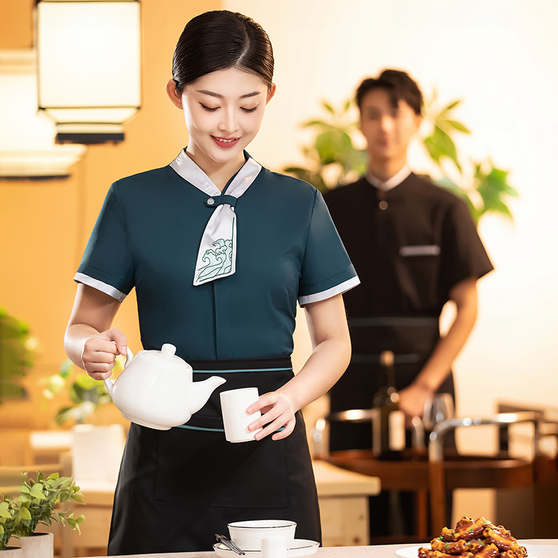 Baju kerja pelayan katering Hotel, setelan Wanita lengan pendek restoran cina rumah teh pot panas toko pakaian musim panas