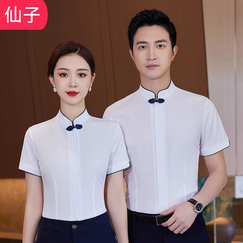 Pakaian kerja katering wanita, lengan pendek restoran cina pot panas restoran hotel pelayan meja depan staf pakaian musim semi dan musim panas