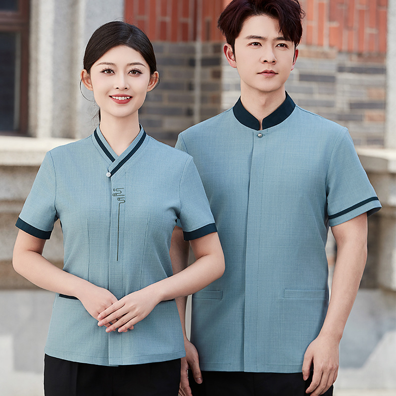 Baju kerah berdiri musim panas pria dan wanita, baju kerja pelayan restoran, rumah teh gaya China katering, baju biru lengan pendek