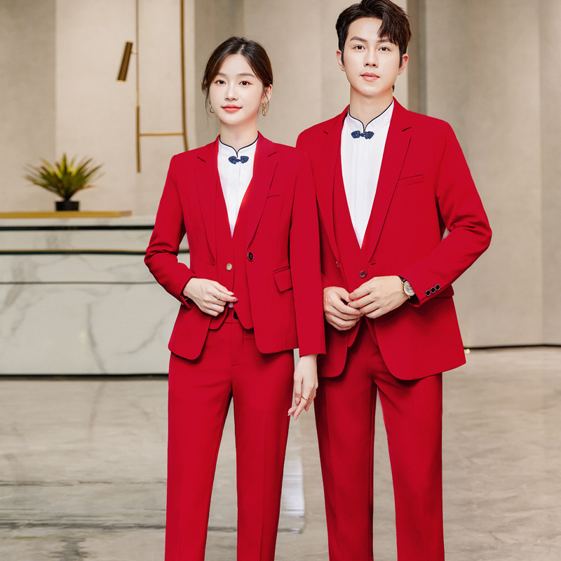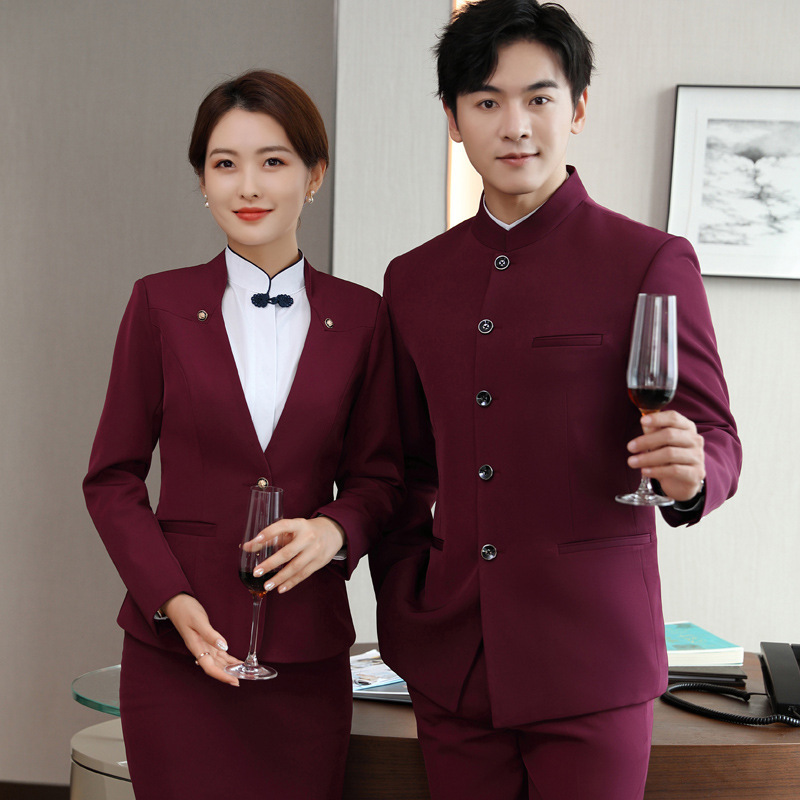 Setelan profesional pria dan wanita setelan yang sama hotel restoran pelayan meja depan penjualan berdiri kerah baju kerja gaya Cina