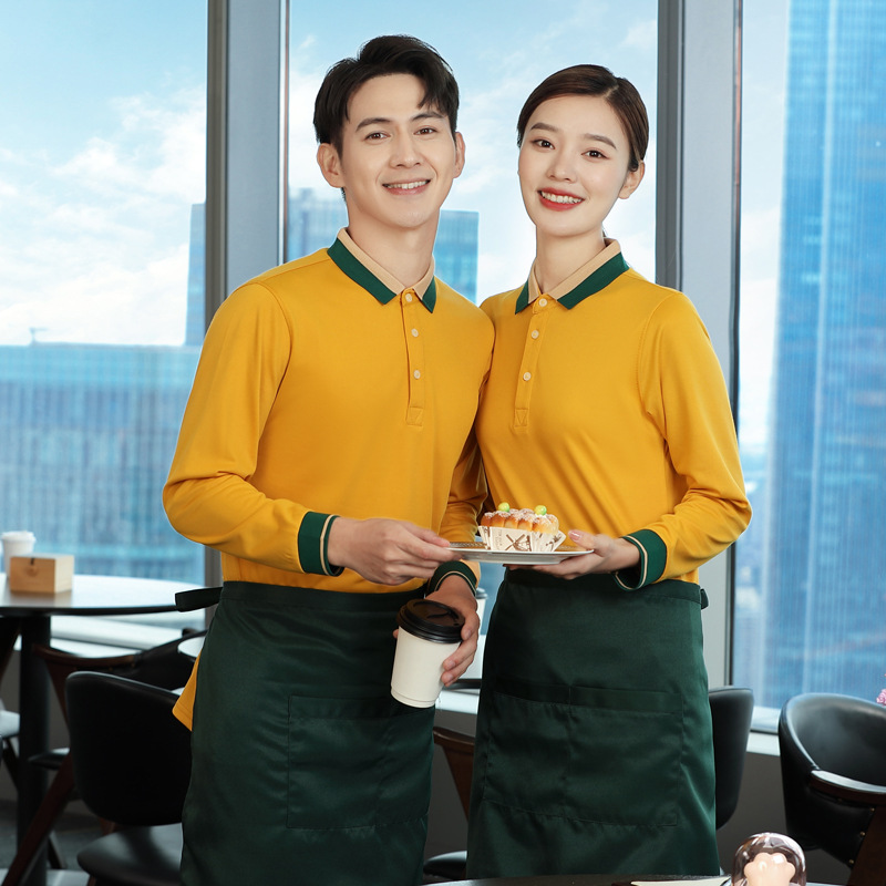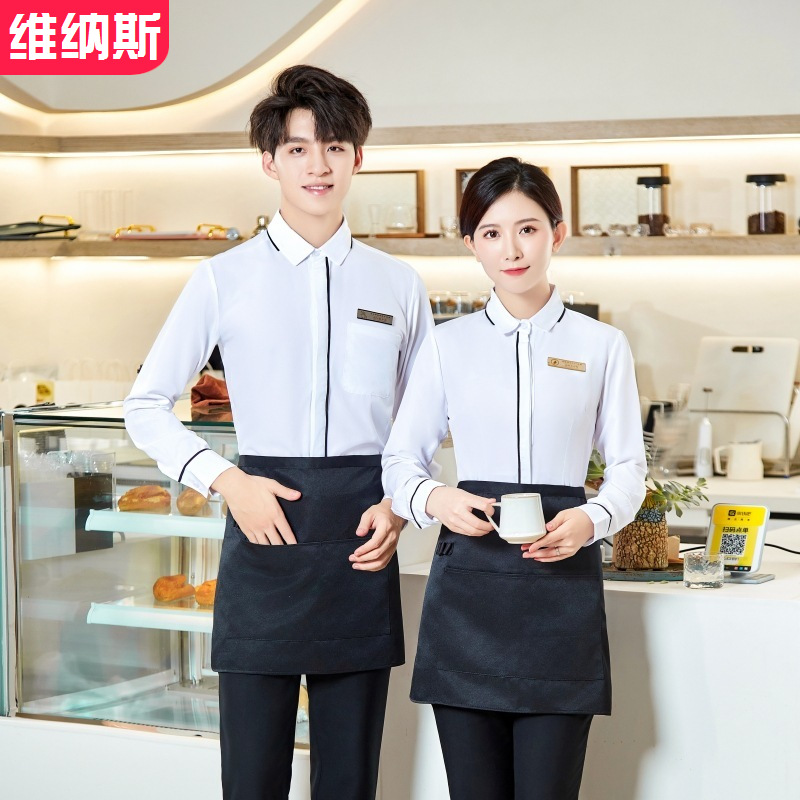 Seragam kerja pelayan restoran Barat kelas atas, lengan panjang, untuk hotel, hot pot, hotel, toko teh susu, kopi, dan kue, kemeja musim gugur dan musim dingin