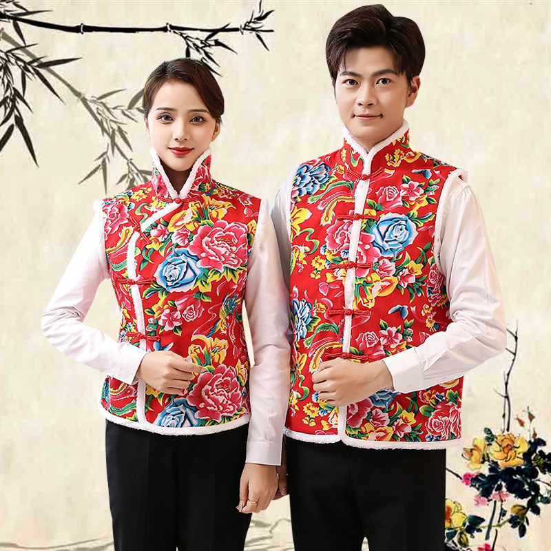 Restoran katering Hotel pot panas restoran rumah pertanian kain bunga besar timur laut pakaian kerja pelayan rompi setelan Tang rompi katun
