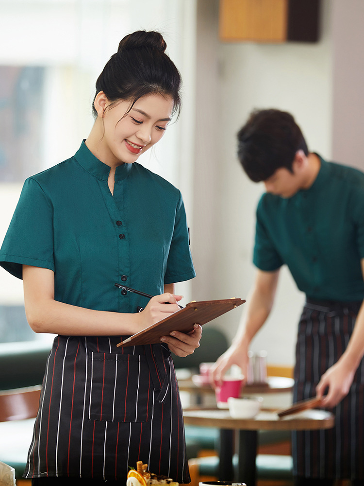 Baju kerja pelayan katering wanita, pakaian musim panas lengan pendek restoran cina pot panas restoran hotel meja depan staf kerja