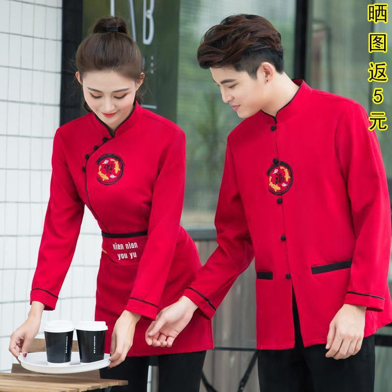 Baju kerja wanita Nongjiale, lengan panjang musim gugur dan musim dingin wanita retro China ruang makan rumah teh panas pot restoran pakaian pelayan
