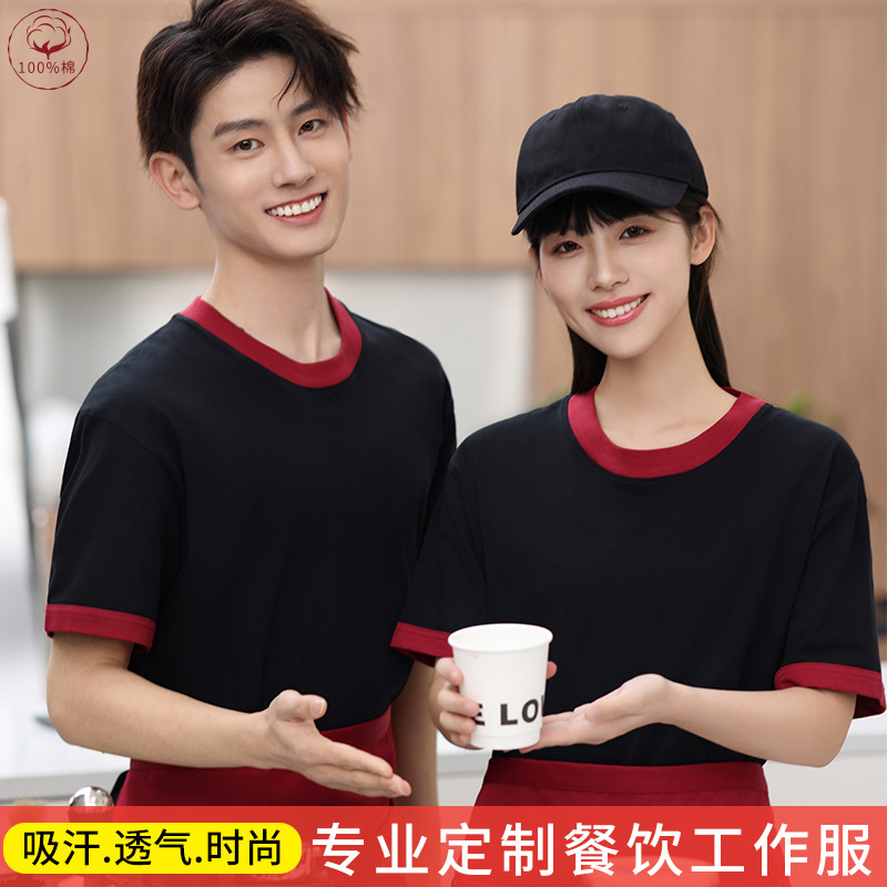 Pakaian Kerja Katering Katun Murni T-shirt Musim Panas Teh Susu Restoran Hot Pot Barbekyu Staf Hotel Kerah Lengan Pendek