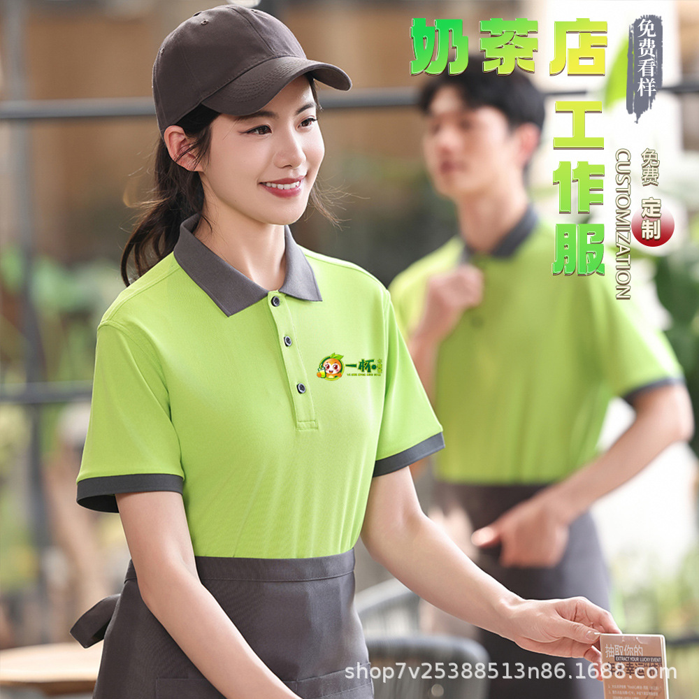 Kaus pakaian kerja katering logo lengan pendek, pakaian kerja pelayan restoran pot panas teh susu cepat makanan musim panas