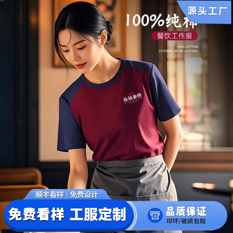 Pakaian Kerja Katering Katun Murni Kerah Bundar Kustom Musim Panas T-shirt Barbekyu Toko Hot Pot Susu Pelayan Pakaian Kerja Lengan Pendek