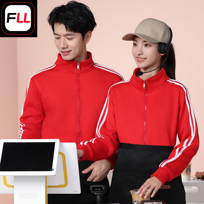 Katering pelayan pakaian kerja, seragam toko kue staf pria dan wanita lengan panjang kerah berdiri sweater ritsleting musim gugur dan musim dingin berlapis bulu