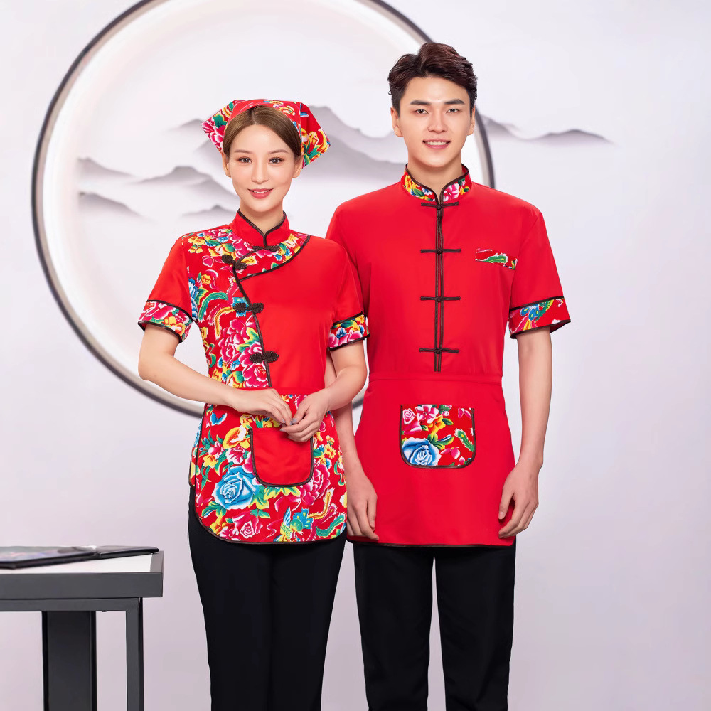 Pakaian Kerja Pelayan Hotel Pakaian Musim Panas Wanita Restoran Restoran Restoran Hot Pot Restoran Nongjiale Kain Bunga Besar Timur Laut Lengan Pendek