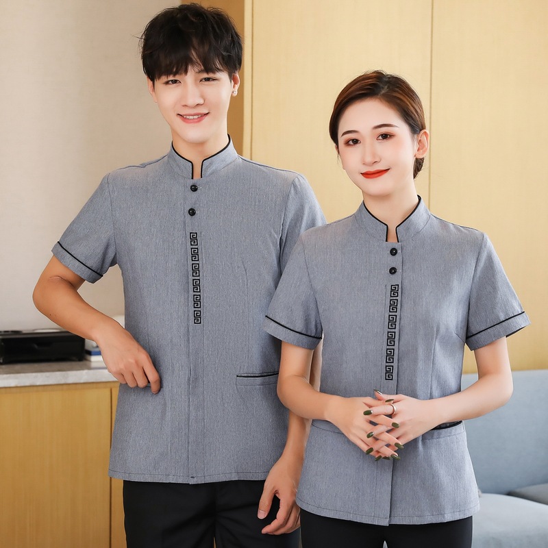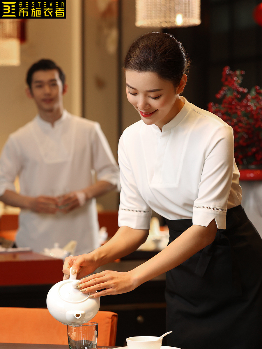 Pakaian kerja pelayan katering, baju kerja lengan pendek gaya China, klub hotel restoran teh khusus restoran pot panas restoran musim panas