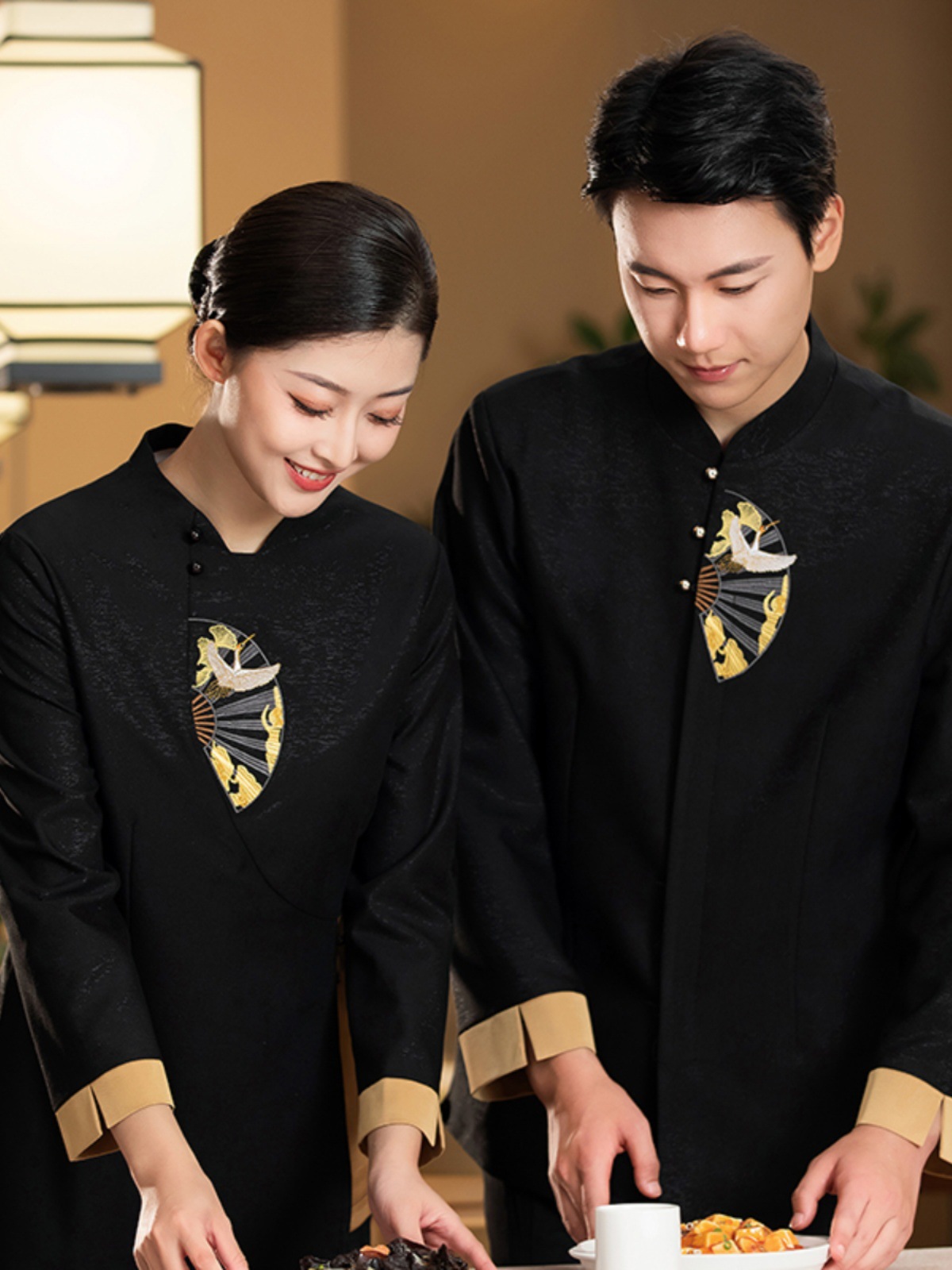 Baju kerja pelayan hotel katering China, pot panas Restoran wanita musim gugur dan musim dingin pakaian lengan panjang gaya China