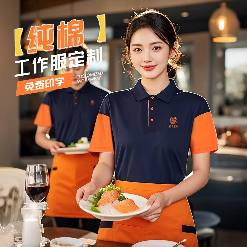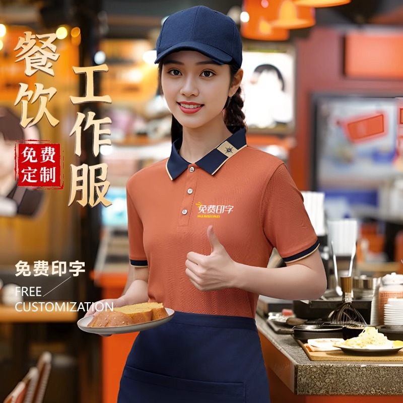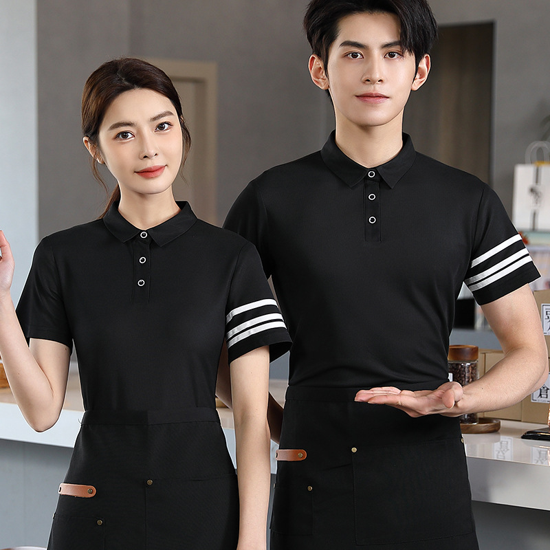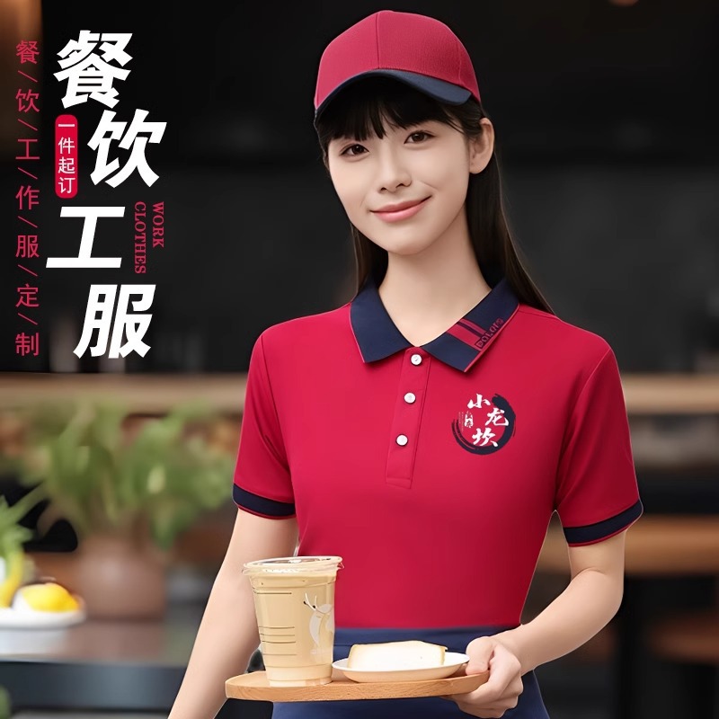 Restoran T-shirt baju kerja lengan pendek motif teh susu restoran pot panas katering musim panas pelayan lapel pakaian kerja tersedia