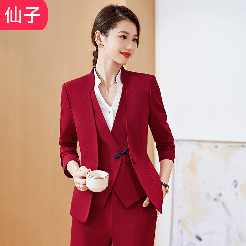 Setelan rompi lengan panjang, pakaian kerja profesional musim semi gaya China elegan pakaian kerja hotel meja depan restoran pelayan