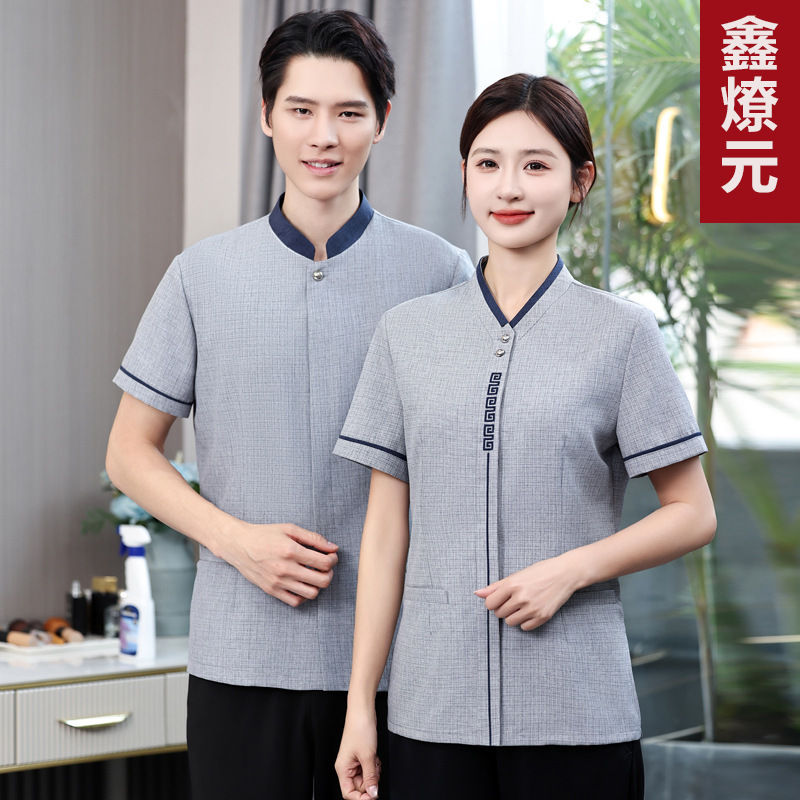 Pakaian kerja kelas atas untuk wanita, pakaian katering hotel gaya China baru restoran teh restoran pelayan musim panas lengan pendek pria