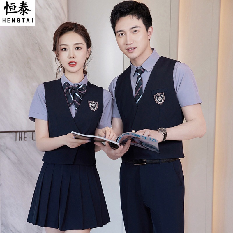 Setelan rompi profesional pakaian kerja pelayan hotel, seragam gaya kuliah pria dan wanita KTV pakaian kerja resepsi musim panas