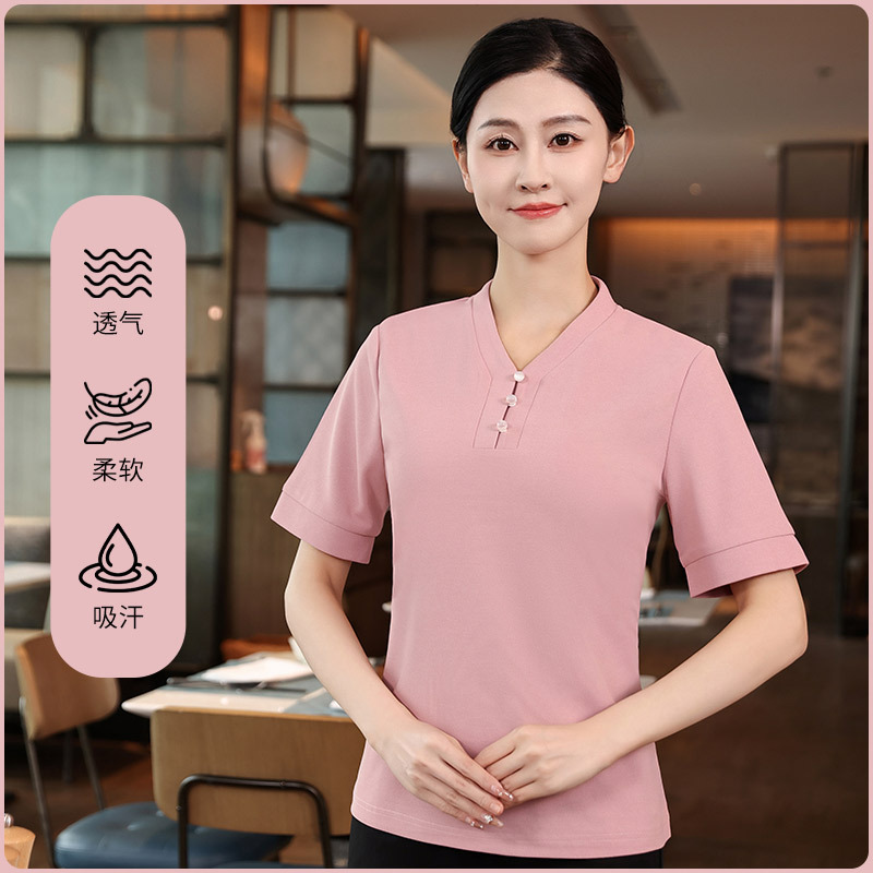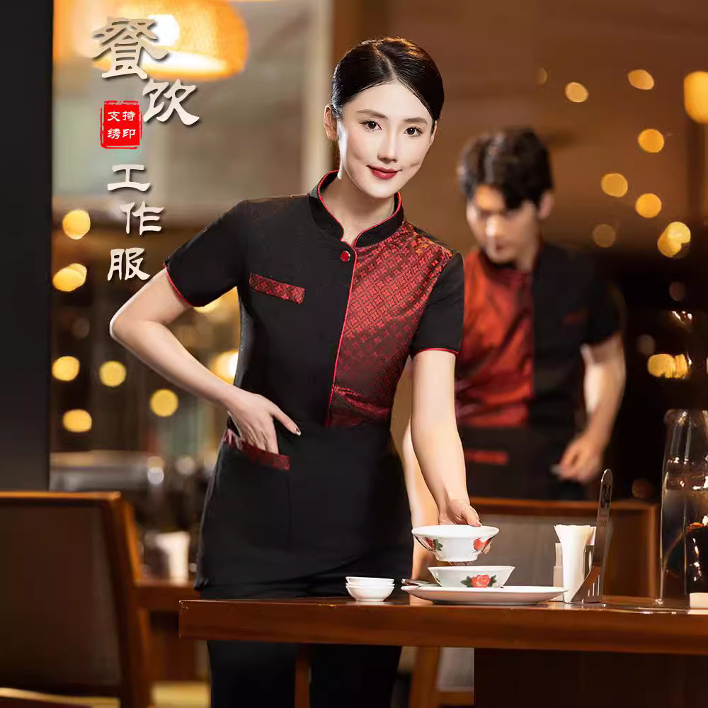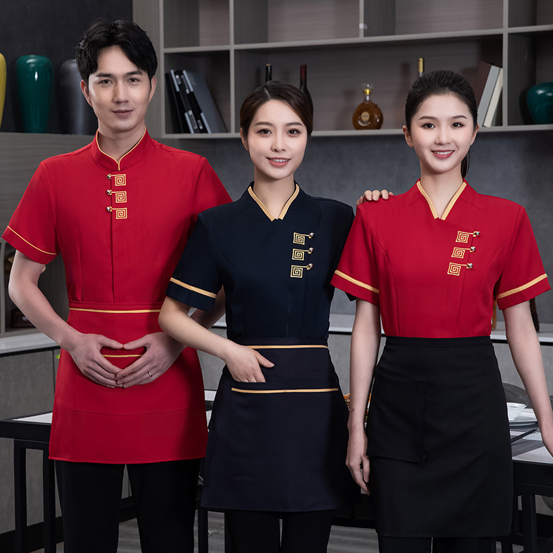 Pakaian kerja hotel gaya China wanita hot pot musim panas restoran katering rumah teh pelayan lengan pendek restoran depan meja staf pakaian kerja