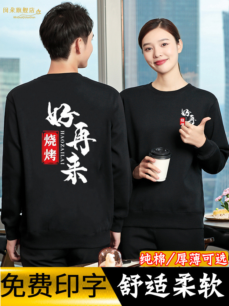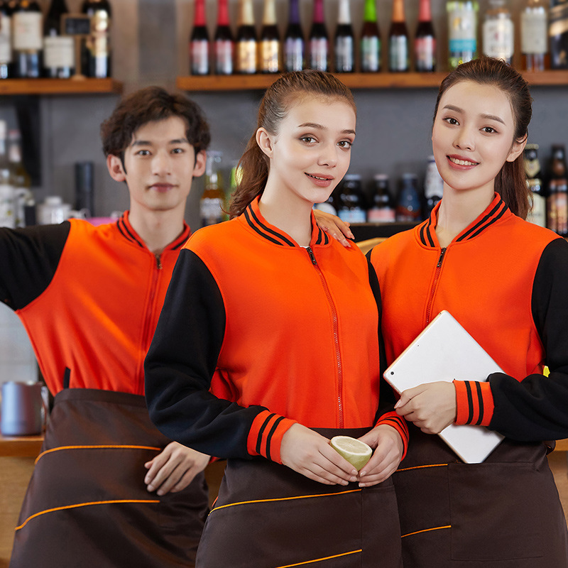 Baju kerja sweater katering pelayan, mantel tebal nyaman bercetak logo musim gugur dan musim dingin hot pot restoran seragam bisbol