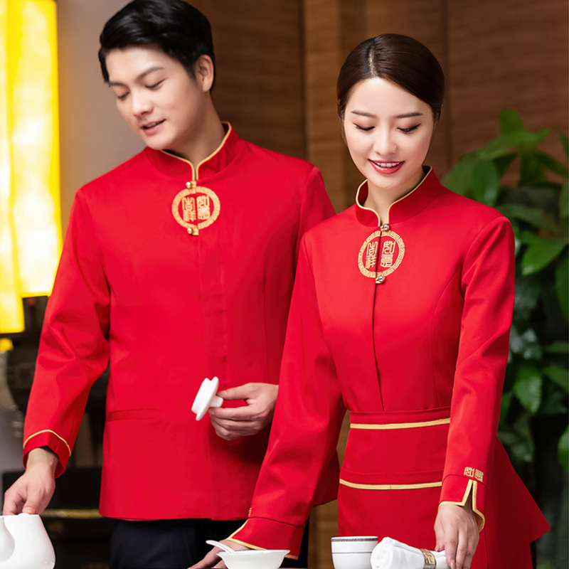 Baju kerja pelayan hotel katering China, pakaian lengan panjang musim gugur dan musim dingin restoran rumah teh restoran