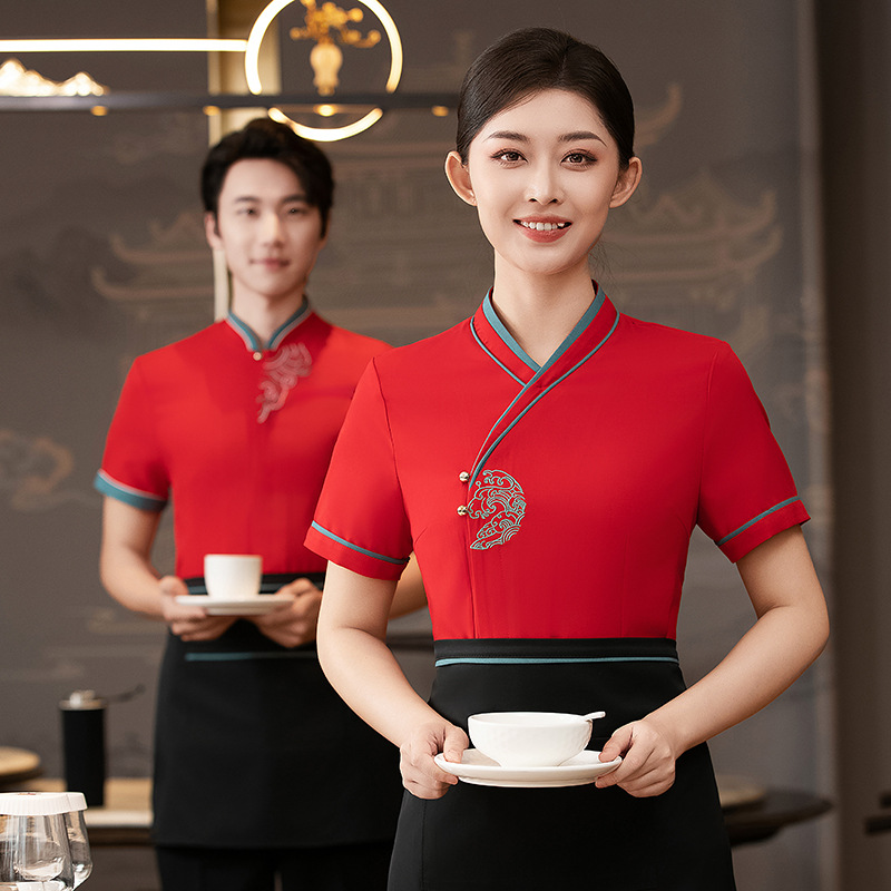 Nongjiale baju kerja pelayan katering, lengan pendek gaya etnik Cina teh restoran pot panas Restoran Barbekyu