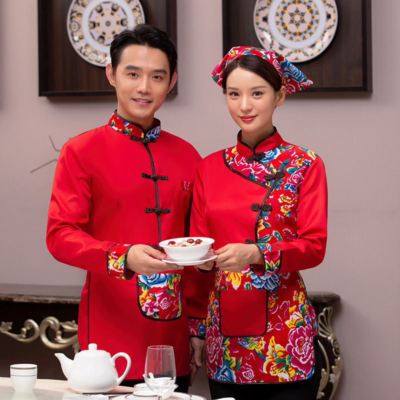Pakaian kerja Hotel musim gugur dan musim dingin wanita restoran katering pot panas restoran pelayan rumah pertanian kain bunga besar timur laut lengan panjang