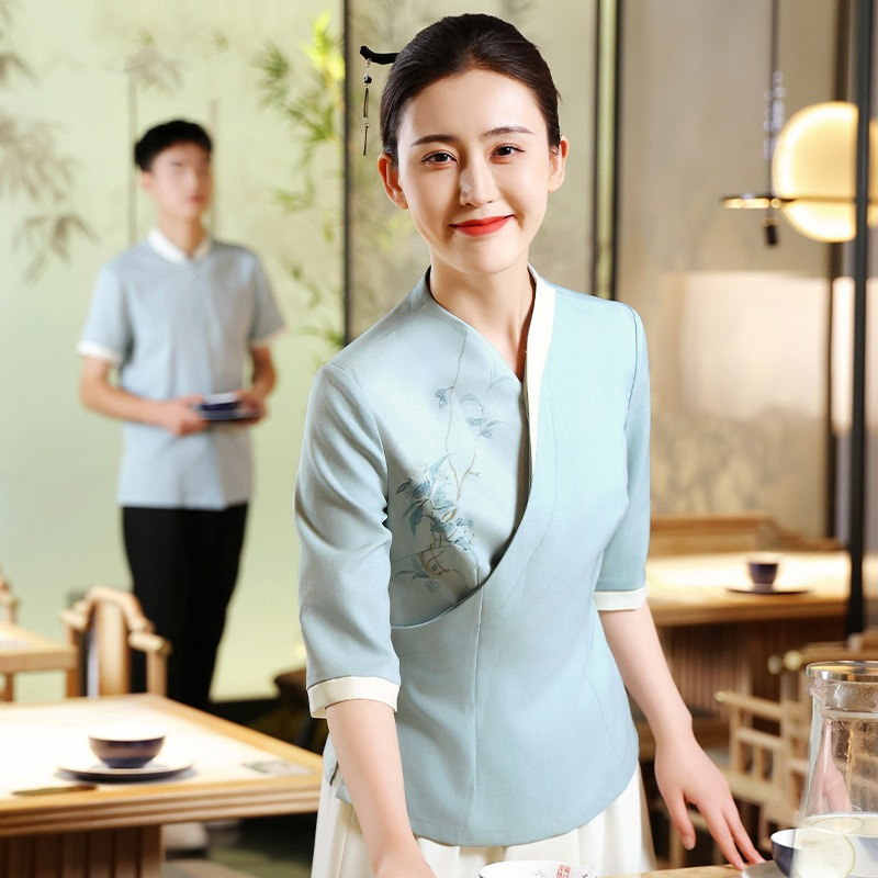 Yiyantang pakaian kerja pelayan restoran teh, baju staf katering Cina lengan pendek restoran hotel rumah teh musim panas