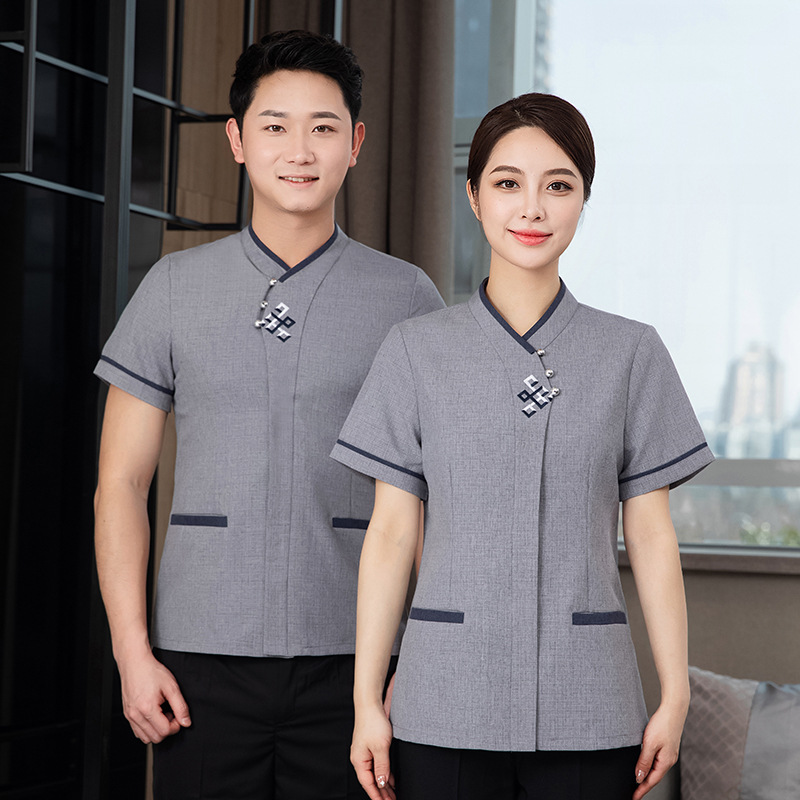 Pakaian Kerja Bibi Pembersih Hotel Tiongkok Lengan Pendek Kamar Properti Wanita Pria Pekerja Rumah Tangga Pembersih Musim Panas Bernapas