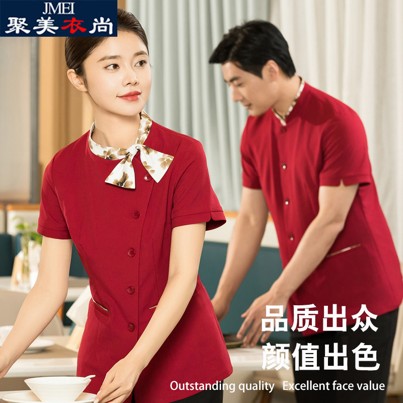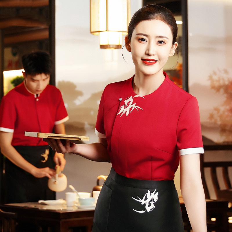 Yiyantang seragam kerja restoran wanita, pakaian pelayan restoran gaya China lengan pendek bintang hotel restoran musim panas