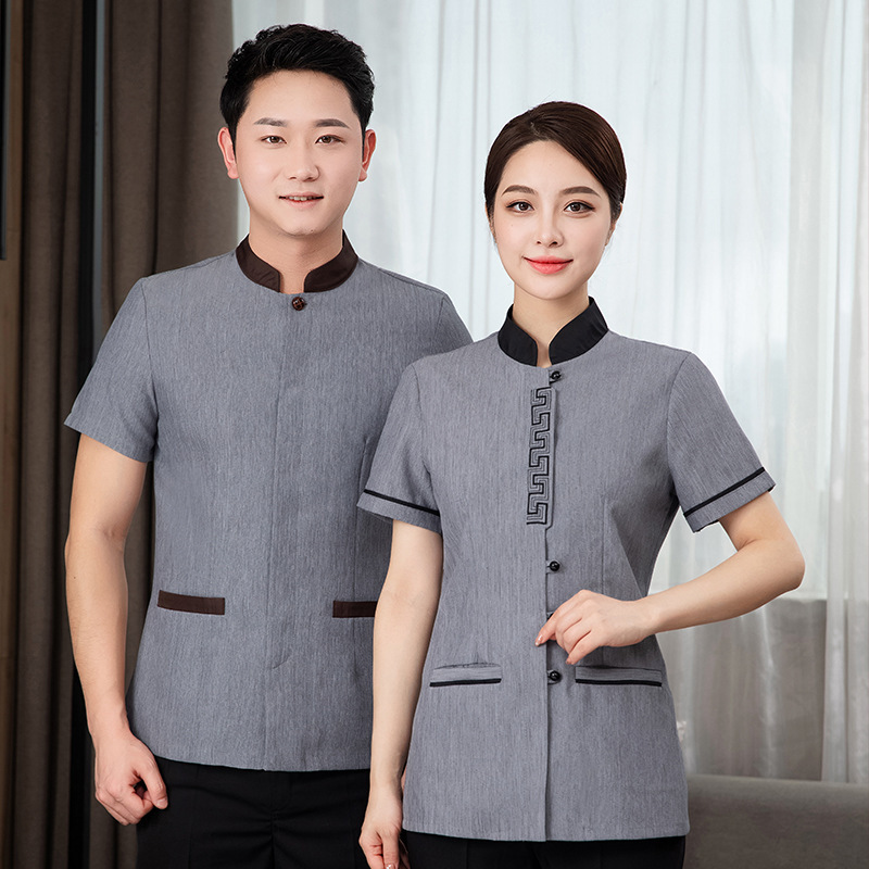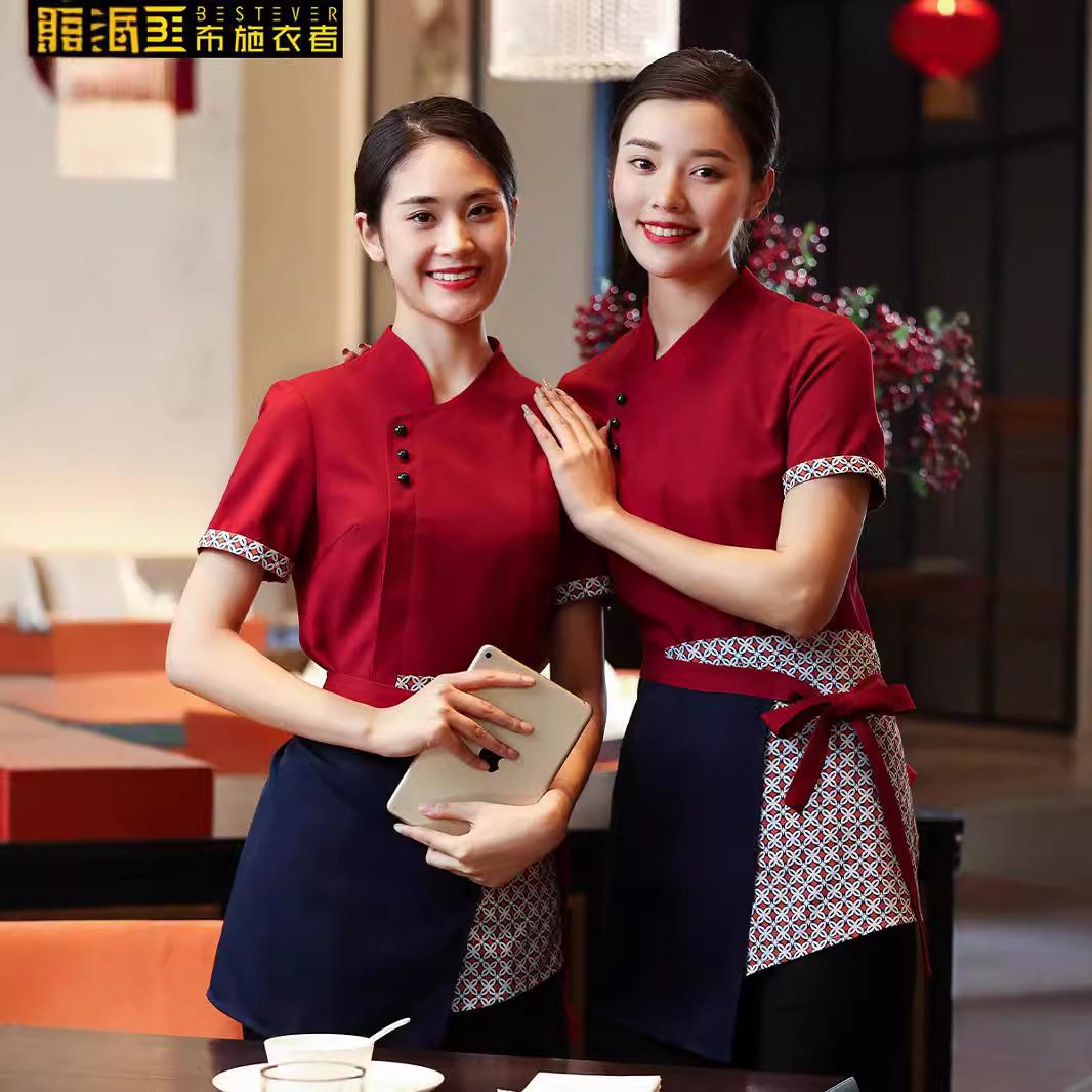Pelayan restoran Cina, pakaian kerja pelayan hotel kelas atas lengan pendek wanita pot panas rumah teh Depan seragam kerja kantor kustomisasi