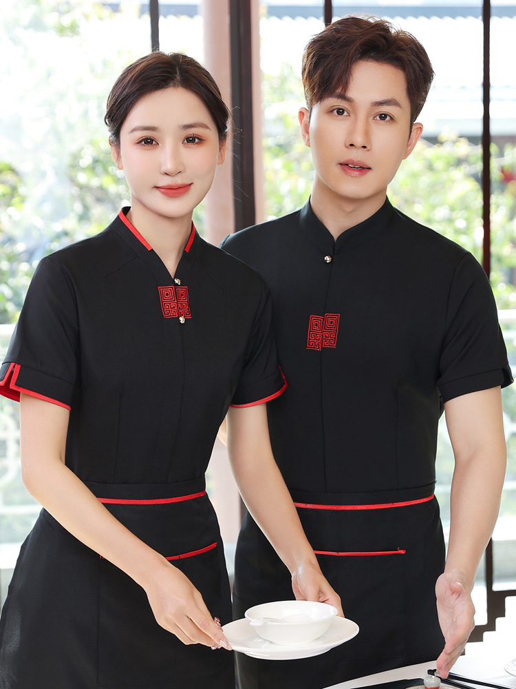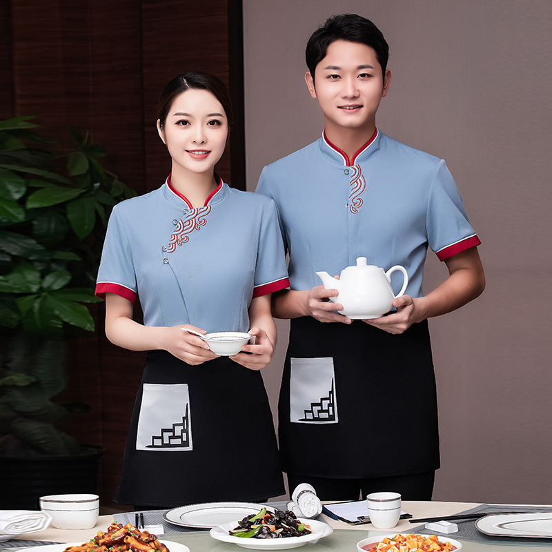 Pakaian kerja hotel gaya China wanita hot pot musim panas restoran katering rumah teh pelayan lengan pendek restoran depan meja staf pakaian kerja