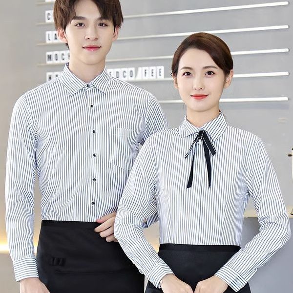 Pelayan pakaian kerja bergaris kemeja pria dan wanita sama profesional baju setelan barat restoran depan meja kasir pakaian kerja