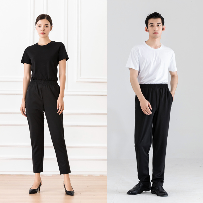Celana kerja hitam elastis penuh, celana terusan pelayan pembersih, celana koki katering, celana modis Pria Wanita