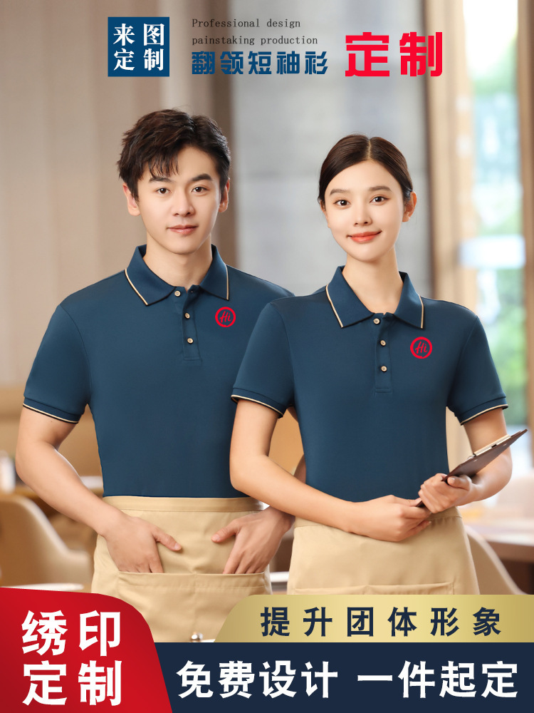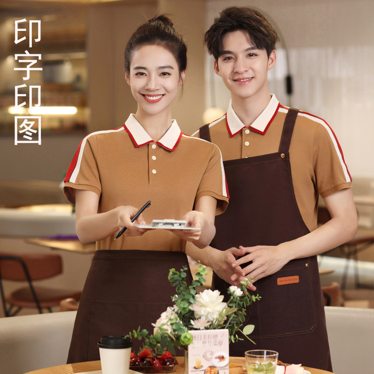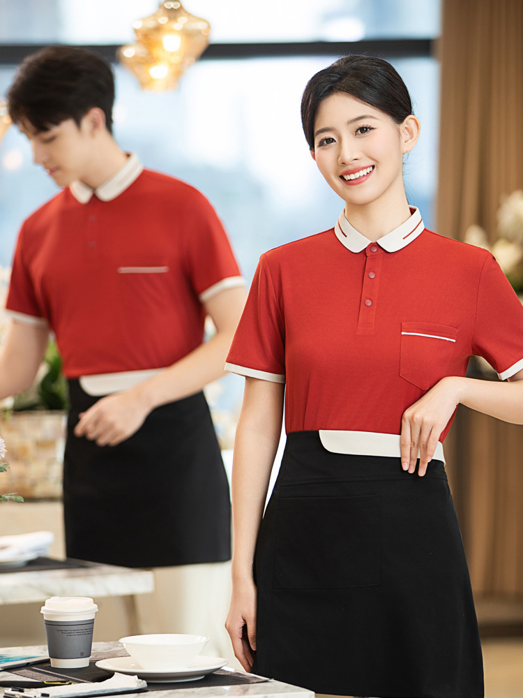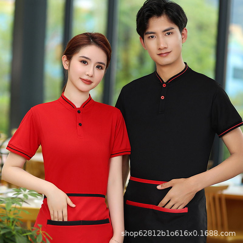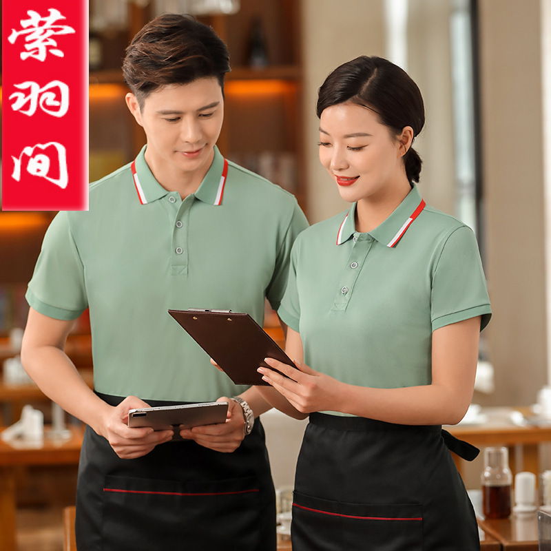 Pakaian kerja katering lengan pendek, kaus polo katun sutra es lengan pendek untuk hotel kopi cina dan restoran Barat pelayan pakaian kerja