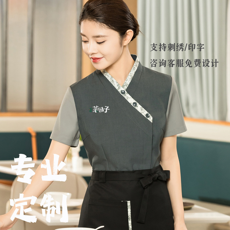 Pakaian Kerja Pelayan Katering Gaya Tiongkok Pakaian Kerja Musim Panas Kustom untuk Restoran Linen Kelas Atas Gaya Tiongkok Lengan Pendek