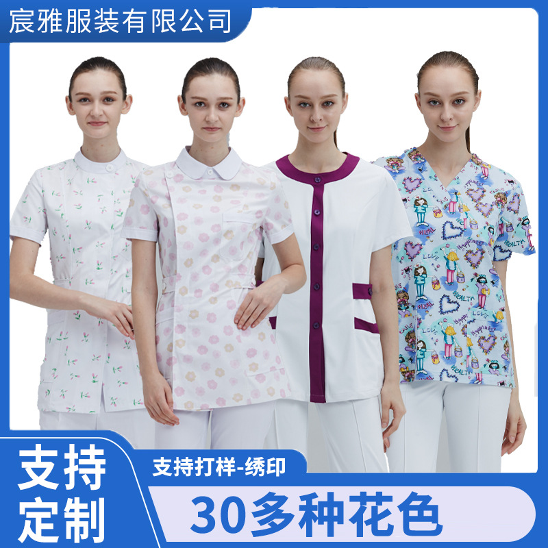 Pakaian perawat bunga setelan terpisah pusat keperawatan staf lengan pendek confinement tipis musim panas baju overall bermotif