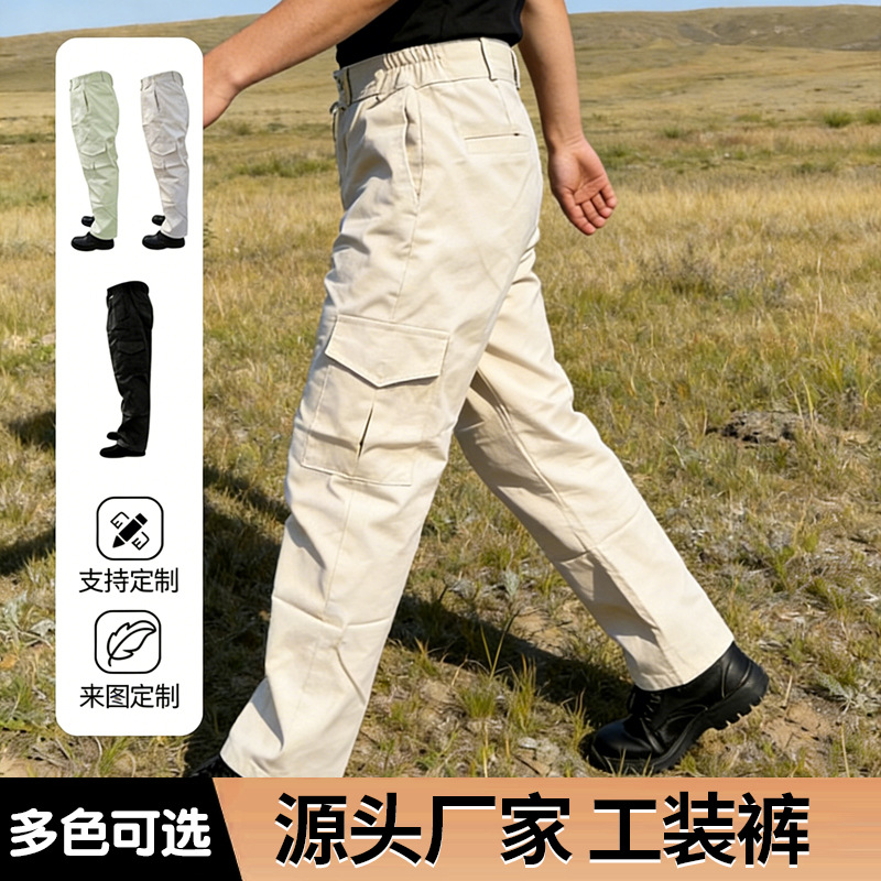 Baju kodok katun pria, setelan pakaian pelindung kerja kamuflase elastis Musim Semi dan Gugur, tukang las multi-saku kasual ukuran plus