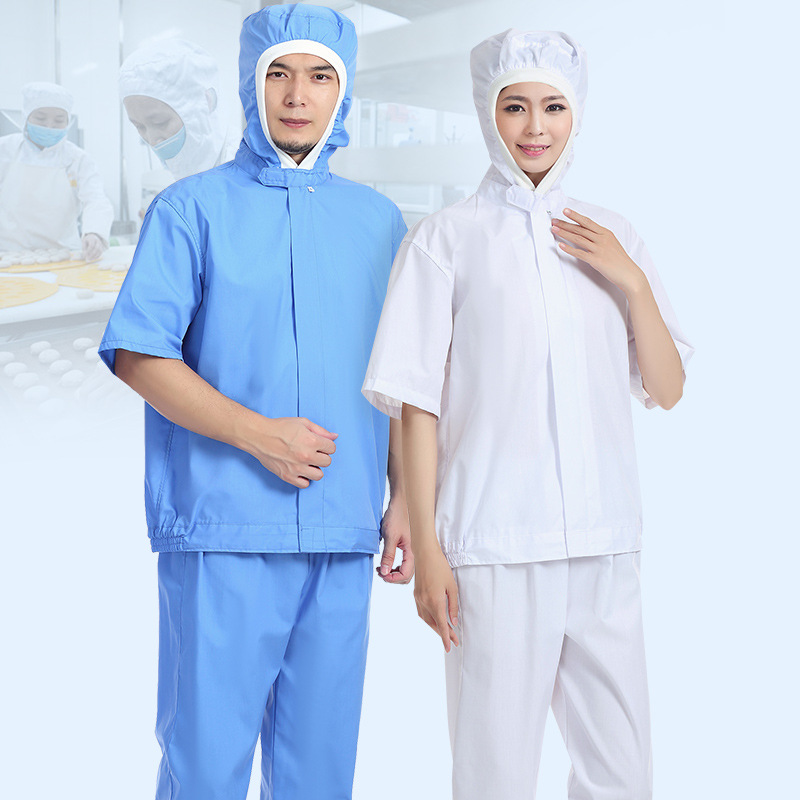 Tipis berkerudung lengan pendek pakaian kerja pabrik makanan perkakas biru putih bersirkulasi pabrik lokakarya logo menyerap keringat
