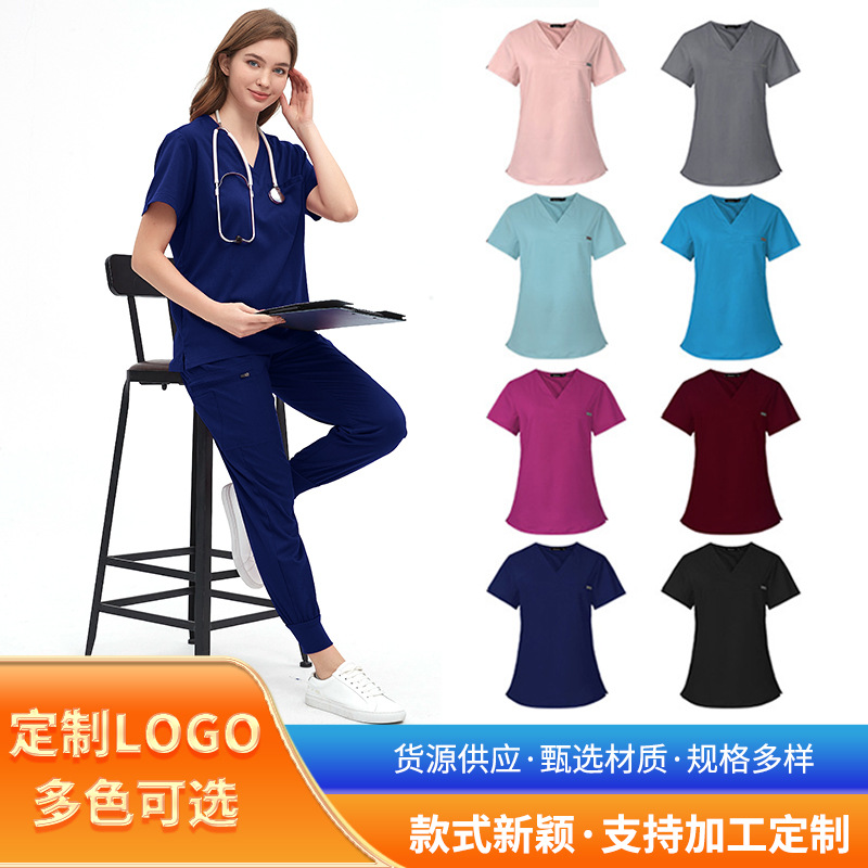 Seragam perawat wanita Amazon, atasan kaos V-neck, celana, seragam bedah, setelan pakaian kerja, gaya jas putih medis