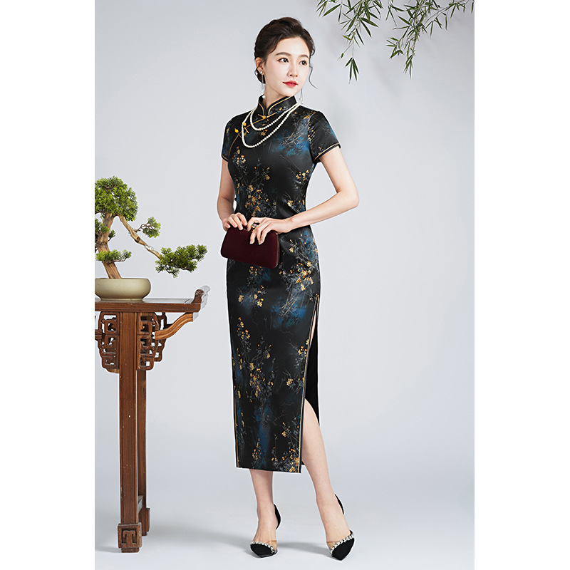 Gaun malam cheongsam hitam untuk wanita, gaun tuan rumah mewah kelas atas gaya Tiongkok baru 2024, Gaun jamuan makan dewasa