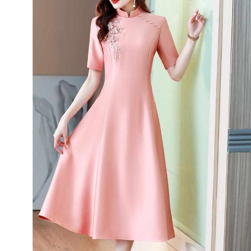 Gaun modifikasi Cina baru kain jacquard gaun merah muda gesper buatan tangan gaun cheongsam B0336-2