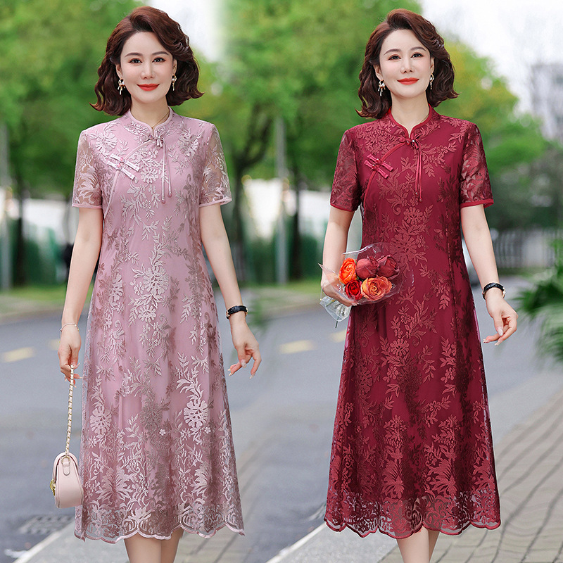 Gaun Musim Panas Ibu Gaun Pesta Pernikahan Ibu mertua Mulia Gaya Barat Gaun Cheongsam Musim Panas Wanita Setengah Baya Rok Renda