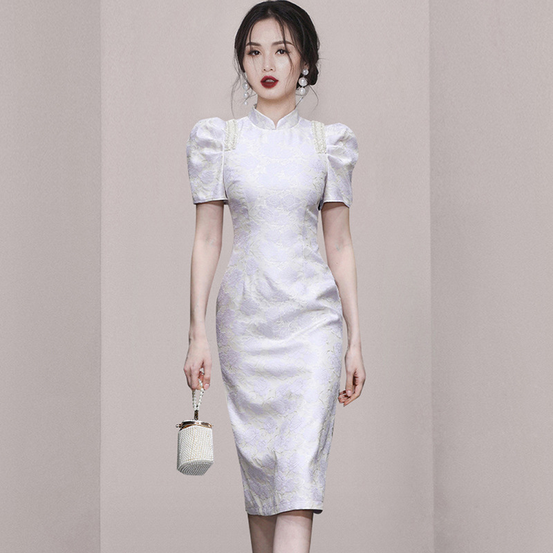 Gaun cheongsam manik-manik jacquard elegan slim-fit musim panas 2023 pakaian wanita perdagangan luar negeri gaun ketat pinggang modis